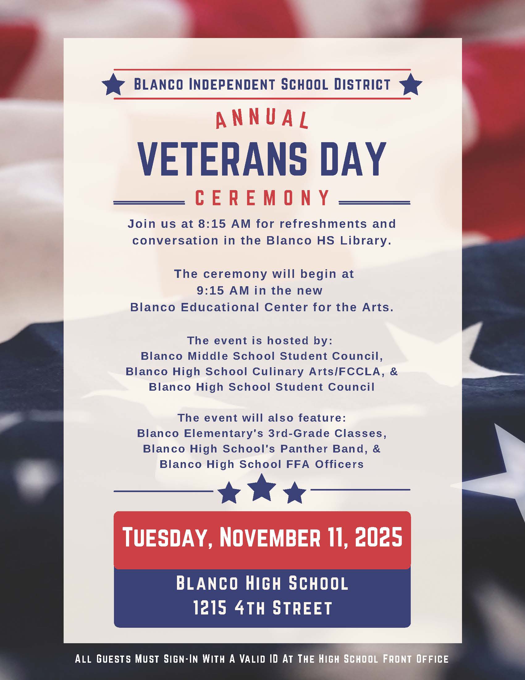 The Blanco Independent School District invites all veterans to attend its Annual Veterans Day Ceremony on Tuesday, November 11, 2025.